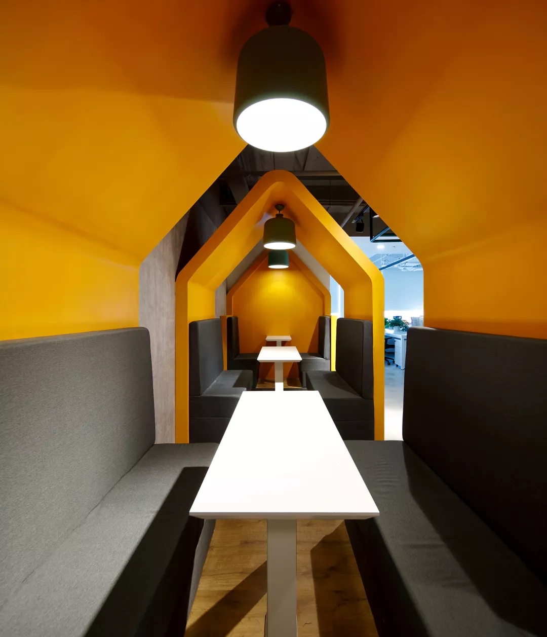 最新完成的整層辦公區(qū)延續(xù)了主體風(fēng)格,少了花俏的點(diǎn)綴,更多地使用色彩碰撞來(lái)提振精神,比如亮橙色開(kāi)放會(huì)議間與品牌VI的臟灰色搭配。也首次嘗試了全白色調(diào)的通透會(huì)議室,算是對(duì)極致風(fēng)格的小探索。