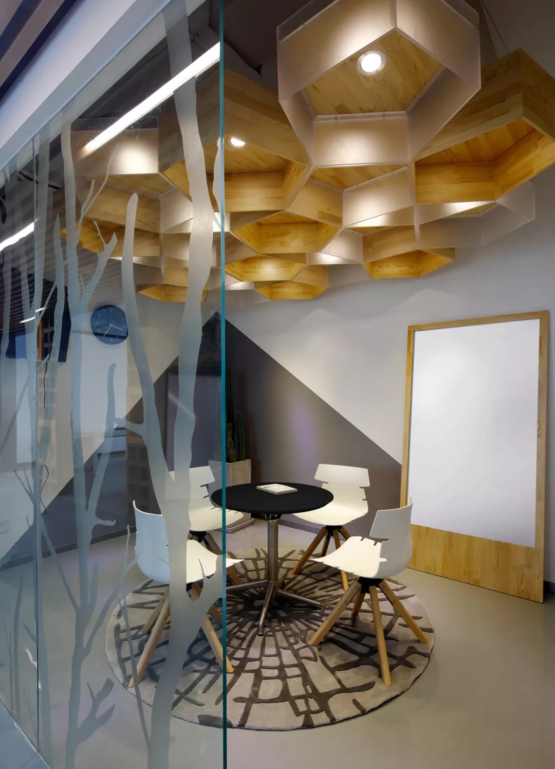 為了給開(kāi)放式的辦公空間注入活力,我們?cè)谂排抛墓の粓?chǎng)地正中設(shè)置了“破殼而出“的主形象——巨蛋討論區(qū),橢圓形的蛋壁實(shí)現(xiàn)攏音的隔音效果,兩側(cè)的鏤空引入自然光源,令這個(gè)裝置藝術(shù)般的討論區(qū)打破開(kāi)放式工位的沉悶,成為視覺(jué)焦點(diǎn)。