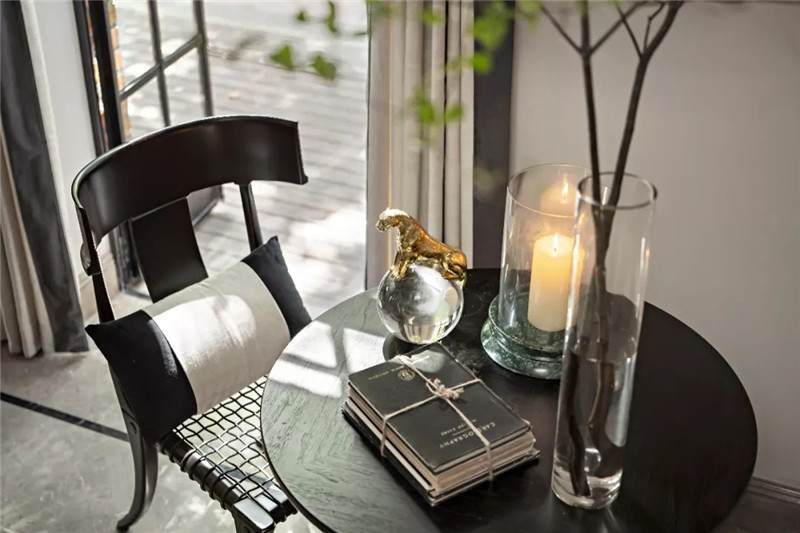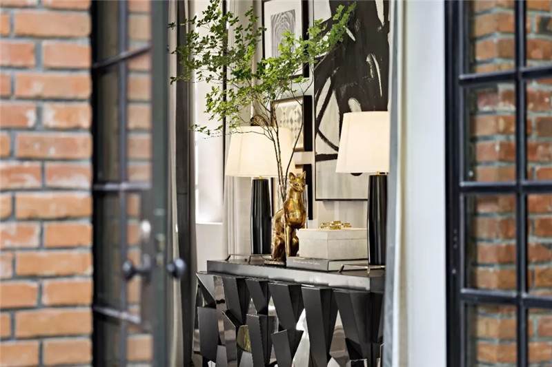 起居室背景展示墻,以混搭風(fēng)格鋪陳出洛普普的敘事展現(xiàn)。原始的羚羊頭飾,彷若征服野性蠻荒,象征勝利光輝。鑰匙是正在延續(xù)著的權(quán)勢標(biāo)志。設(shè)計師用跳色的編織盤與抽象藝術(shù)畫將微量的彩色疊加進(jìn)黑白灰的間隙中,呈現(xiàn)出別樣、細(xì)膩的風(fēng)情。而左下角的守護貓,一如埃及傳說中神秘的幸運守護者,正看顧著明亮通透的窗外,不斷朝曦夕映的美好時光。