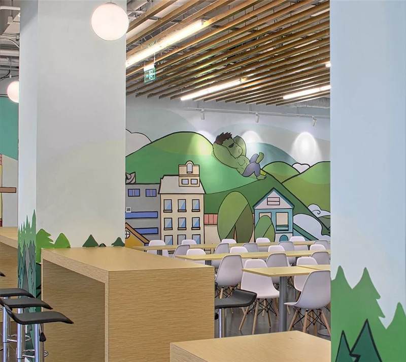 空間氛圍不同,所以圖形裝飾也會(huì)因地制宜的改變,用暖色更動(dòng)態(tài)的感覺(jué)。繪制的粉筆畫(huà),可以定期的更換,像黑板報(bào)一樣制定不同的主題,它就是一面活的展示墻。