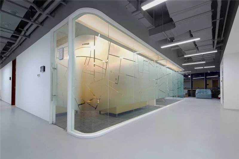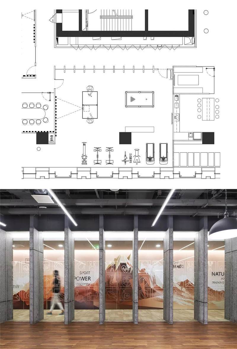 健身房采用的是隔墻類的隔斷,透過(guò)隔墻隔斷玻璃能看到核心筒的走道,核心筒的墻面是一幅大型的噴繪畫(huà),結(jié)合立體字,畫(huà)面比較震撼,再通過(guò)健身房往外看就會(huì)產(chǎn)生非常豐富的層次感。玻璃隔斷上也有小的磨砂圖案,形成了戲劇性的效果,使空間的層次更加突出。