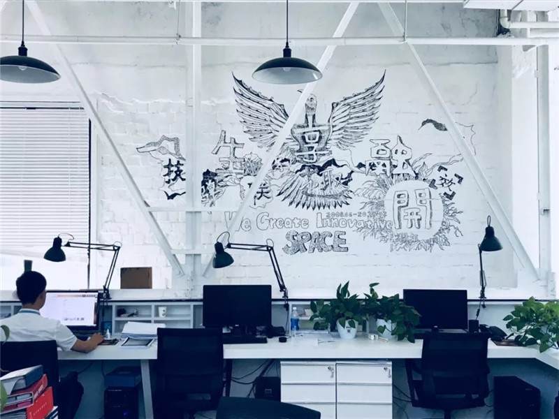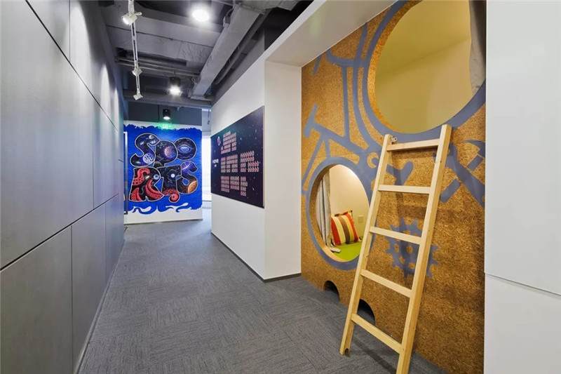 比如這張圖,也是華米科技北京的辦公室,用奧松板開(kāi)兩個(gè)洞,精巧可愛(ài)的睡眠艙趴在墻上,利用兩個(gè)洞把它組成了自行車的輪廓,超萌的壁畫(huà)使墻面不再單一,色彩的對(duì)比更加直觀,同時(shí)用太空艙的形式增添趣味點(diǎn),不論是做設(shè)計(jì)師還是做工匠,都要秉持設(shè)計(jì)的理念去進(jìn)行選材和制造工藝,把握好每一個(gè)細(xì)節(jié)。