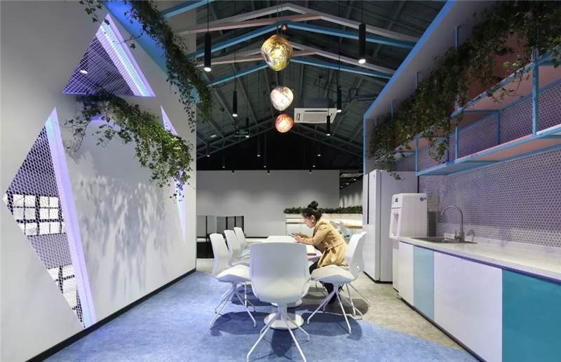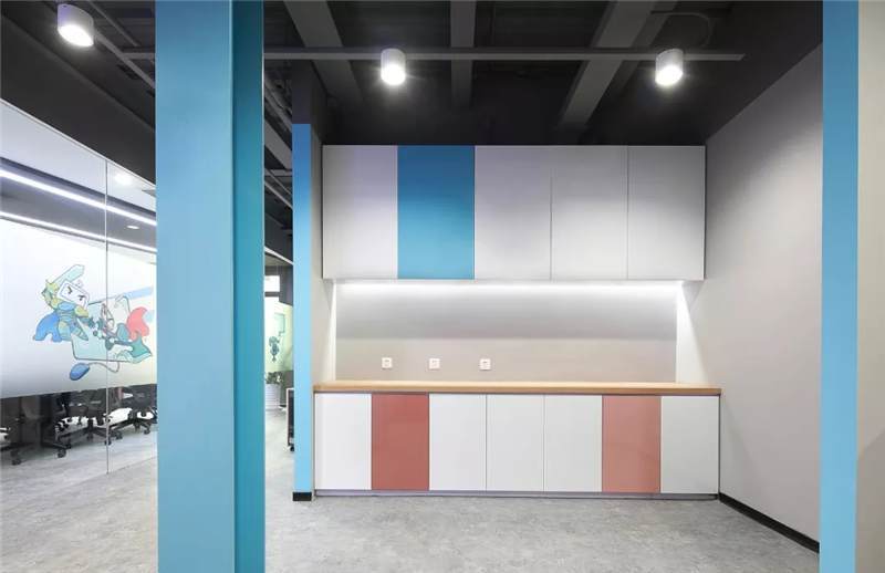 吊柜打破了傳統(tǒng)的平開門形式,使用開放的彩色盒子,實用兼裝飾功能。另外設(shè)計師還根據(jù)層高差,在茶水區(qū)頂部設(shè)計三角形格柵,茶水柜上方及背景墻后方,點綴綠植,使整個空間富有生態(tài)氣息,在光影的效果呈現(xiàn)別樣風(fēng)采。