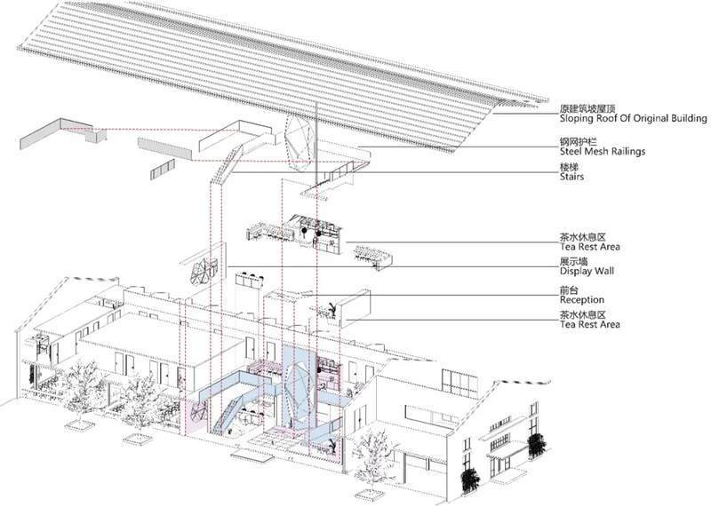 本案位于上海市寶山區(qū)蘊川路6號智慧灣科創(chuàng)園,原建筑為3D打印的廠房裝修,室內(nèi)最高凈高9米,最低6.4米。此空間除原建筑結(jié)構(gòu)墻外,無任何結(jié)構(gòu)柱與墻體,因此為了更充分合理的利用空間,設(shè)計師構(gòu)筑了二層,根據(jù)嗶哩嗶哩電競的辦公功能訴求,布置空間功能區(qū),即1F分布前臺區(qū)、會議區(qū)、茶水接待區(qū)、賽訓(xùn)室、開敞辦公區(qū)、導(dǎo)播室。2F分布就餐區(qū)、住宿區(qū)、導(dǎo)播室等空間。