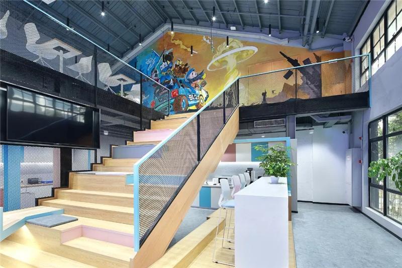 二層大臺階入口處設(shè)計師設(shè)置醒目的電競主題手繪圖,巧妙的把原本的雙開門變成隱形門,墻內(nèi)部為電競導(dǎo)播室。手繪圖豐富的色彩,突出的電競主題,卡通的形象,把BILIBILI的風(fēng)格呈現(xiàn)的淋漓盡致。