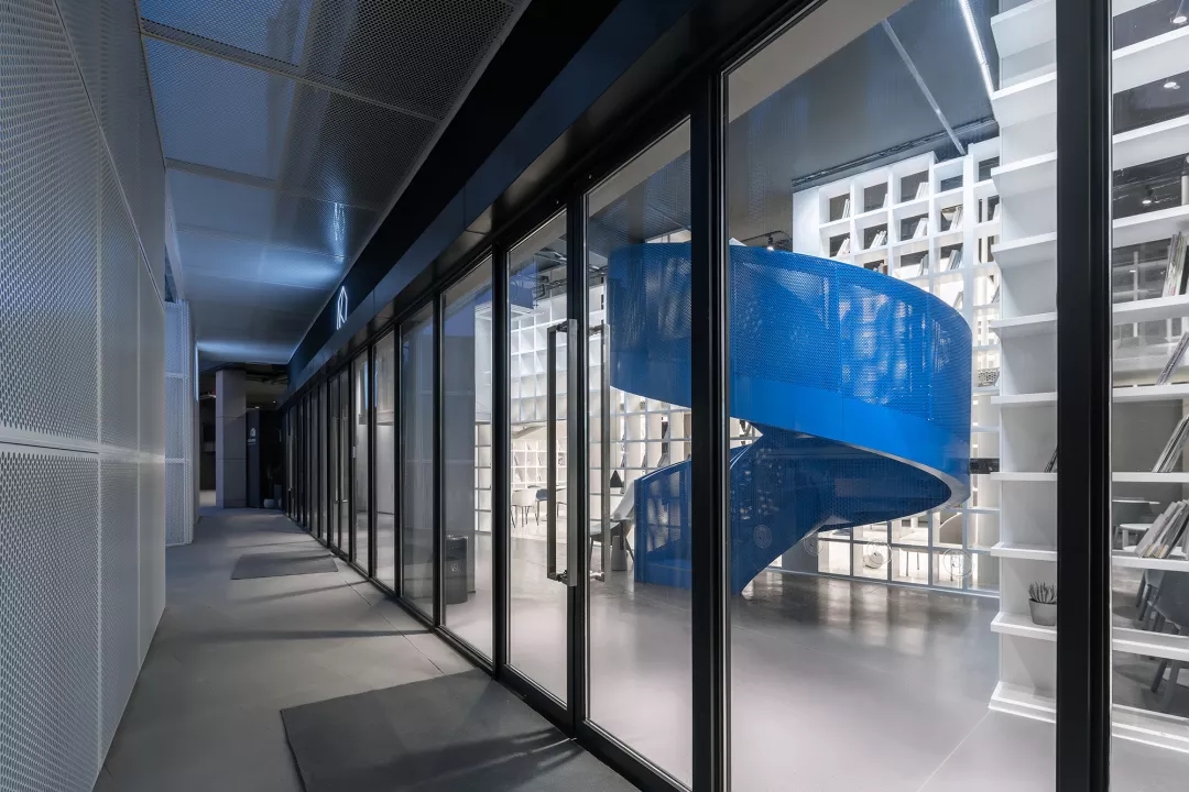 We make the reading room with Tiffany Blue as the core of the Female Box in response to the spiral staircase with Klein Blue at the entry, as well as the external kid’s area with bright yellow color at the back of the box.This community living room would be just a cliché and lose its function of demonstration if it was hidden inside of a commercial space. Youkong Living Room is more like an opening box on its façade. The four-meter high semi open entrance is made of perforated aluminum panels, which is a representational move of Wutopia Lab that from there you can see warm and gentle lightings, bright blue colors and kid‘s laughter.