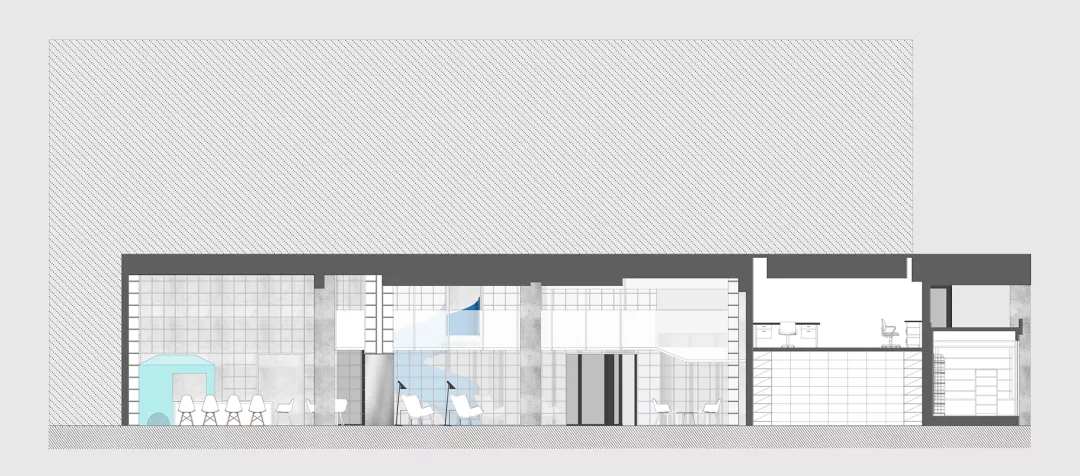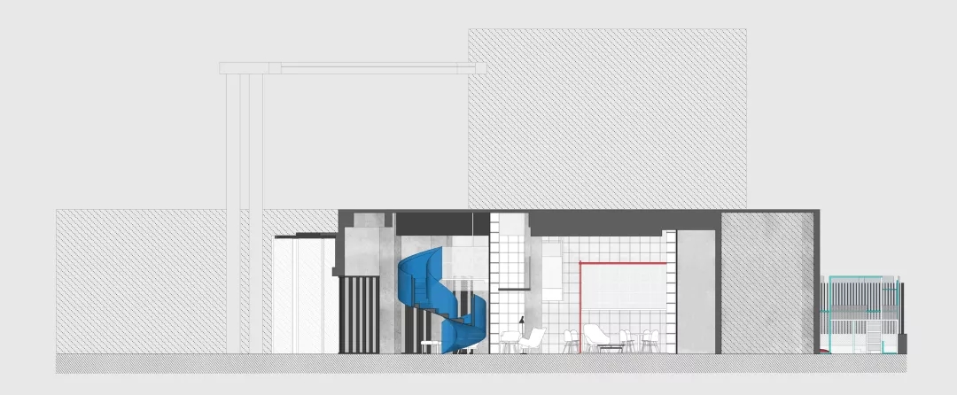 我用蒂芬妮藍閱讀屋作為女性盒子的中心,與此呼應的是入口可見的卡萊茵藍螺旋樓梯,以及盒子背面室外的明黃色兒童活動場地。他們精致地鑲嵌在有些迷離模糊的空間中成為點睛之筆。如果社區(qū)客廳藏在陳詞濫調(diào)的商業(yè)里面之后,就失去了示范作用。有空客廳的立面就是一個打開的盒子,高4米的半開門是穿孔鋁板制作的,形成了Wutopia Lab標志性的半透明界面。你能從這里隱隱約約的窺看到,溫暖的燈光,明亮的藍色,和孩子的笑聲。