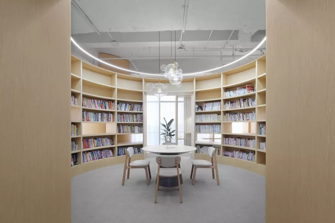 空間的劃分當中,“圓形”起到了至關(guān)重要的作用,包括培訓室和圖書閱覽室的設(shè)計,運用圓形圓潤的特質(zhì),柔和的將空間劃分,從而使空間的運用上富有彈性,動線的流通更加靈活。位于西北角的圖書閱覽室,是整個室內(nèi)空間體量最大的一部分,同時也是此次設(shè)計亮點之一,它可放大約3000本書籍。