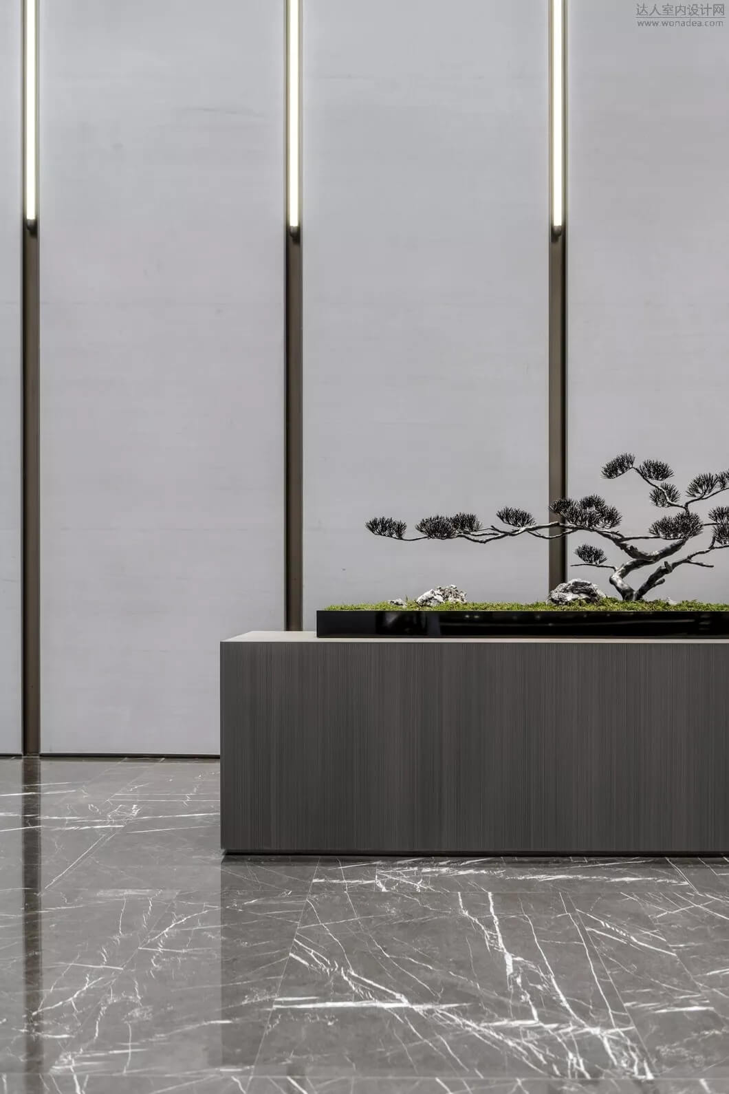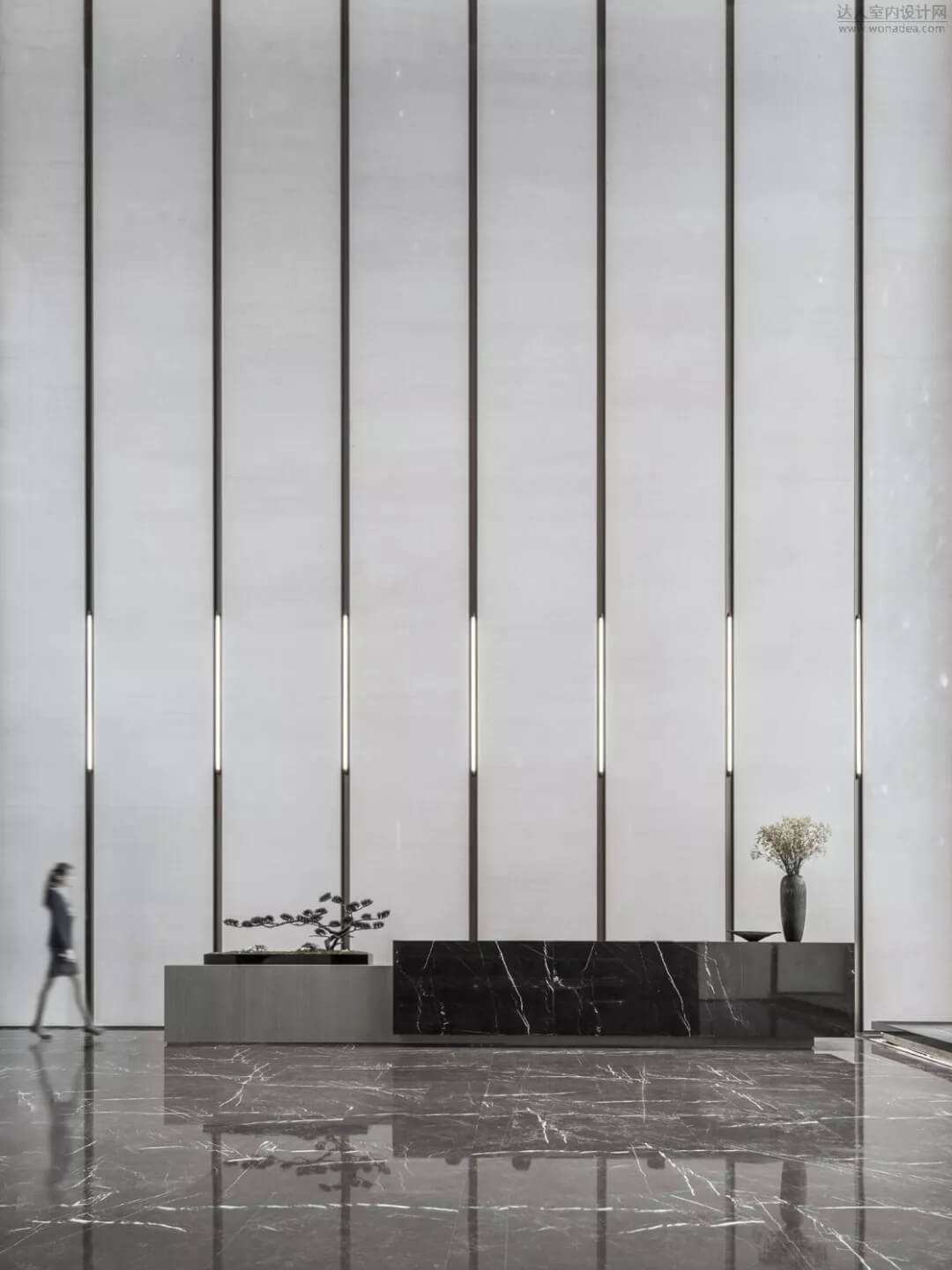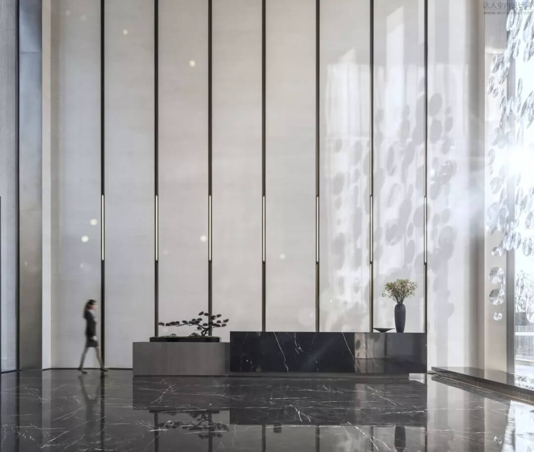 通過豐富的景觀區(qū)進入門廳,感受到空間的空靈,立面設(shè)計過濾了來自于外界的繁復(fù)。十米挑空的大廳,墻面以米色砂巖為基底,黃銅色金屬強化縱向的比例,凸顯出空間的氣勢。入口對景設(shè)置的水景讓穿梭其中的訪客仿若能傾聽到潺潺水聲,同時水景和懸掛的軟裝裝置相得益彰,充滿巧妙的用意,同時也分隔了挑高通透的玻璃幕墻,虛實結(jié)合,體現(xiàn)現(xiàn)代設(shè)計的東方神韻。
