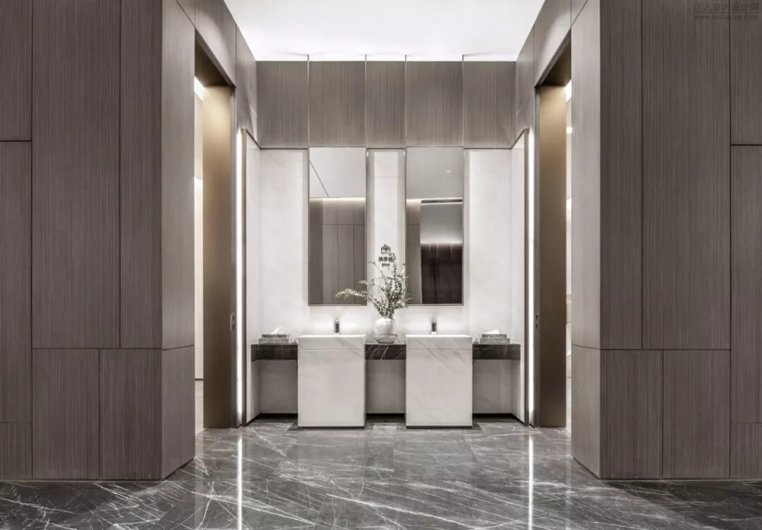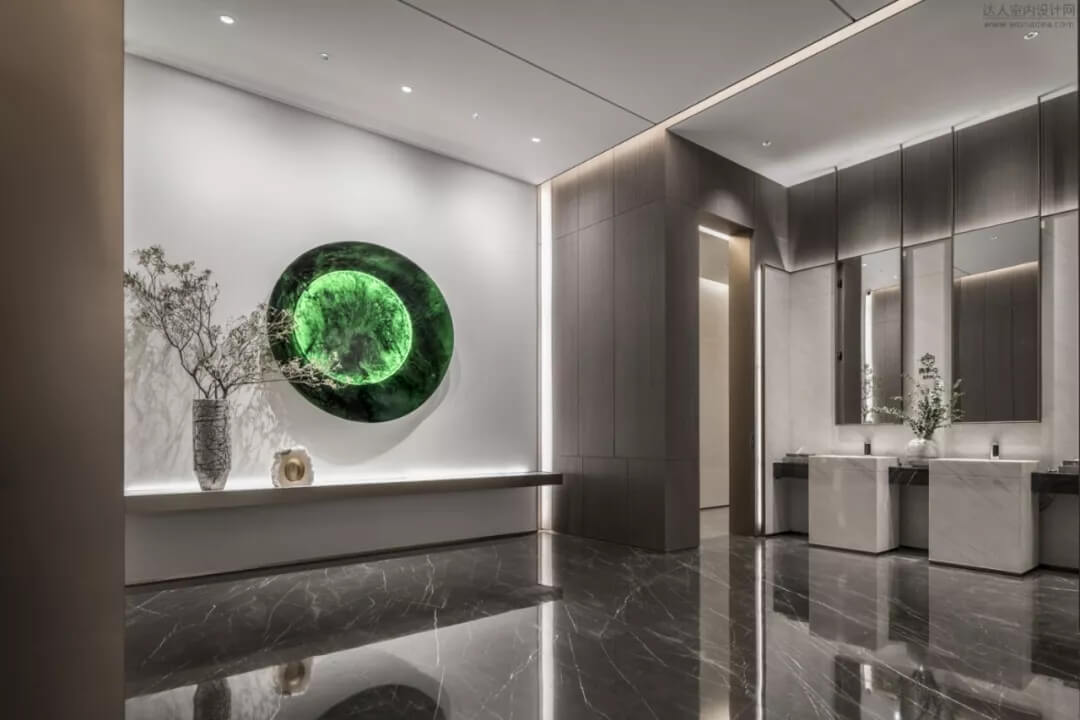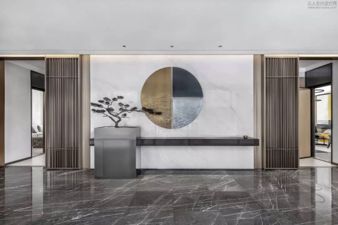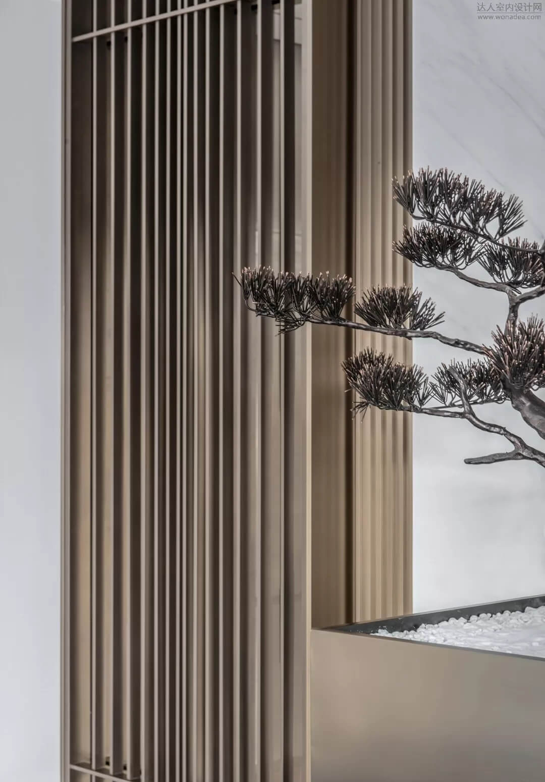 通過豐富的景觀區(qū)進入門廳,感受到空間的空靈,立面設(shè)計過濾了來自于外界的繁復(fù)。十米挑空的大廳,墻面以米色砂巖為基底,黃銅色金屬強化縱向的比例,凸顯出空間的氣勢。入口對景設(shè)置的水景讓穿梭其中的訪客仿若能傾聽到潺潺水聲,同時水景和懸掛的軟裝裝置相得益彰,充滿巧妙的用意,同時也分隔了挑高通透的玻璃幕墻,虛實結(jié)合,體現(xiàn)現(xiàn)代設(shè)計的東方神韻。