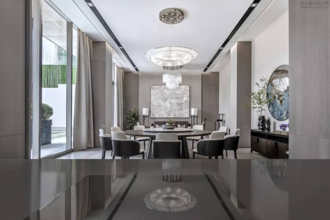 私宴,是以當代設(shè)計來描繪文人飲酒時追求的清雅意境,寄情於山水??臻g通過折疊門和西廚吧臺區(qū)產(chǎn)生互動,空間功能既獨立又有相互滲透。延續(xù)簡潔流暢的線條,布置與空間密切配合。
