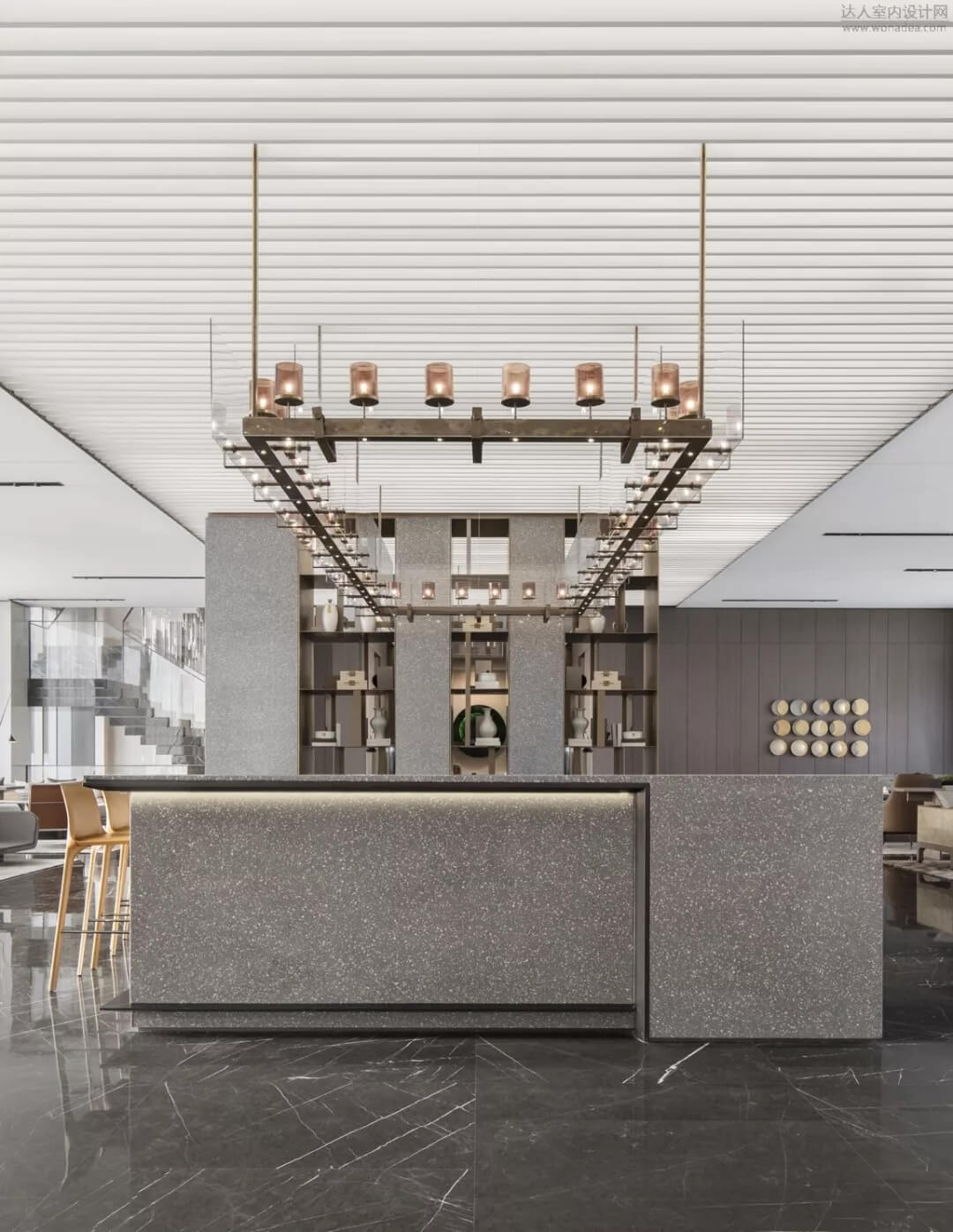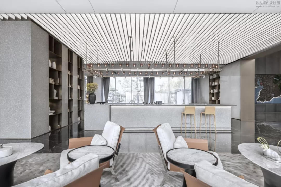 進入洽談區(qū)大廳,通過大面積全明落地玻璃窗,最大程度地將室外的建筑、景觀效果納入室內(nèi)視野,以觀景式空間概念記錄時移景易的歲月縮影。圍合形的水磨石吧臺猶如藝術(shù)裝置,成為空間的中心焦點。