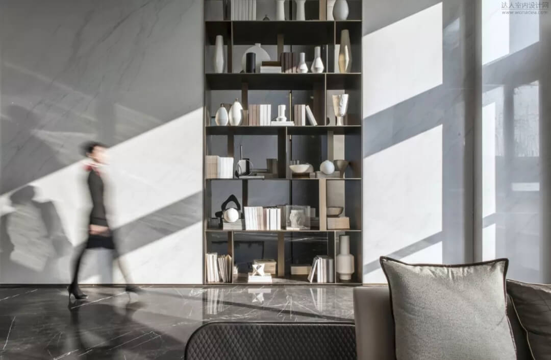 沙盤區(qū)墻面以大花白陶瓷板為主墻面,通過通高的黃銅書架體塊和金屬格柵,本身空間具有很強的中軸對稱的儀式感,凸顯出空間的大氣。曼妙的波浪曲線,以流動的韻律打破空間靜態(tài),同時從明亮空靈的大堂走入半圍合的沙盤區(qū),總能給人帶來新奇感,亦是詩意與藝術(shù)的格調(diào)升華。