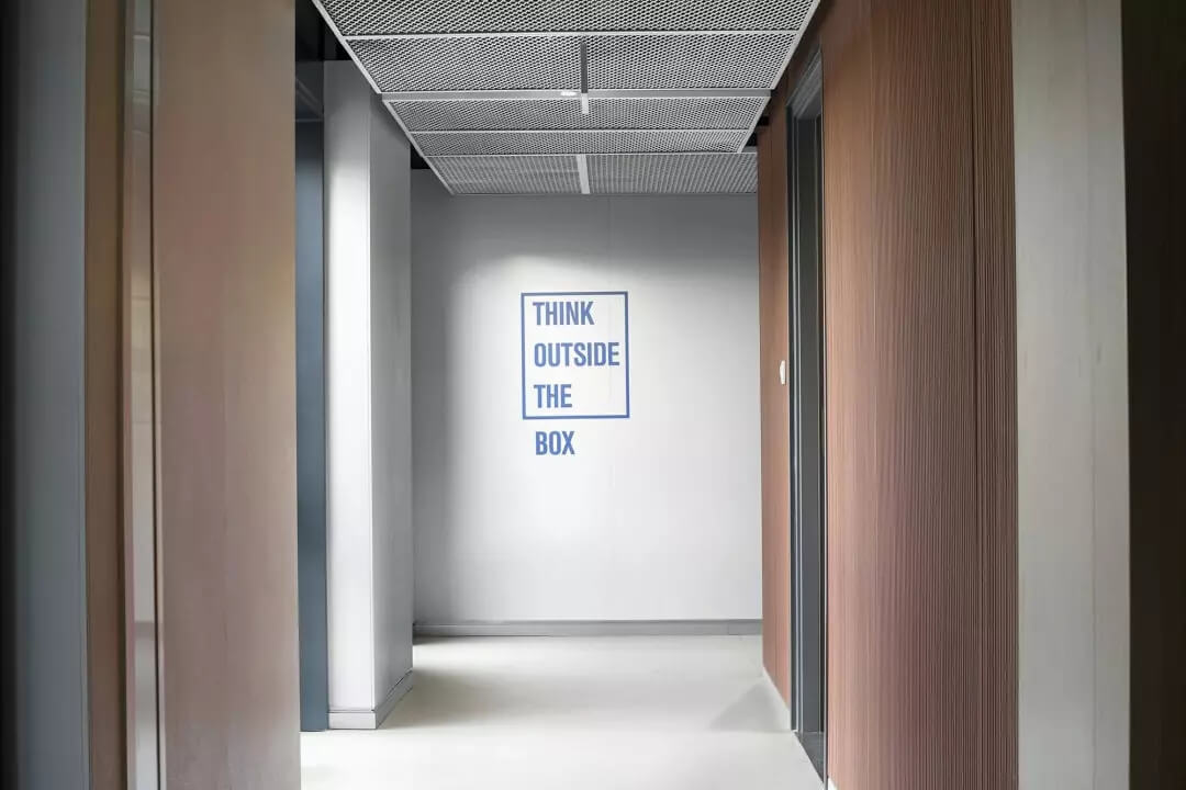 至于盒子以外的空間,我們想凝聚更多的人文藝術氣息,選擇較多地去鋪陳展示各種抽象的藝術線條和畫作,同時為了不失去生活氣息,各個角落選擇顏色比較跳躍的家居什物,讓它作為一個流動的戶外廣場,讓人可以自在穿行其中,偶爾停駐觀察,經得住人聲鼎沸的喧擾,亦能提供心靈靜憩的安寧。在這里,大家認真辦公、生活、盡情交流、分享,它就是一個安放綠意,有極高包容度的公共空間。