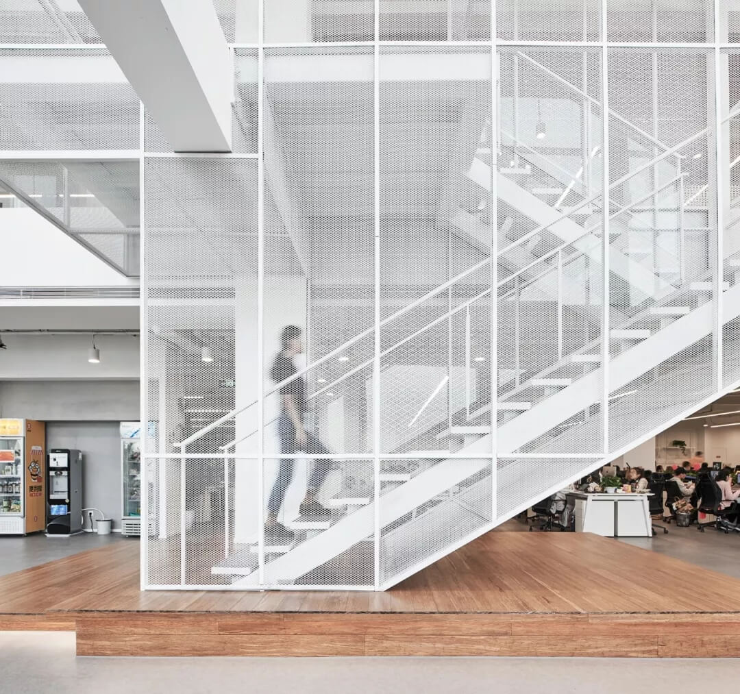云端漫步主題島樓層公共空間設(shè)置了木質(zhì)的懸掛BOX,用白色的鋼網(wǎng)樓梯連接,樸素和輕盈通透形成鮮明的對比,如云端漫步,自然中蘊(yùn)含天馬行空,打開員工的創(chuàng)意想象。