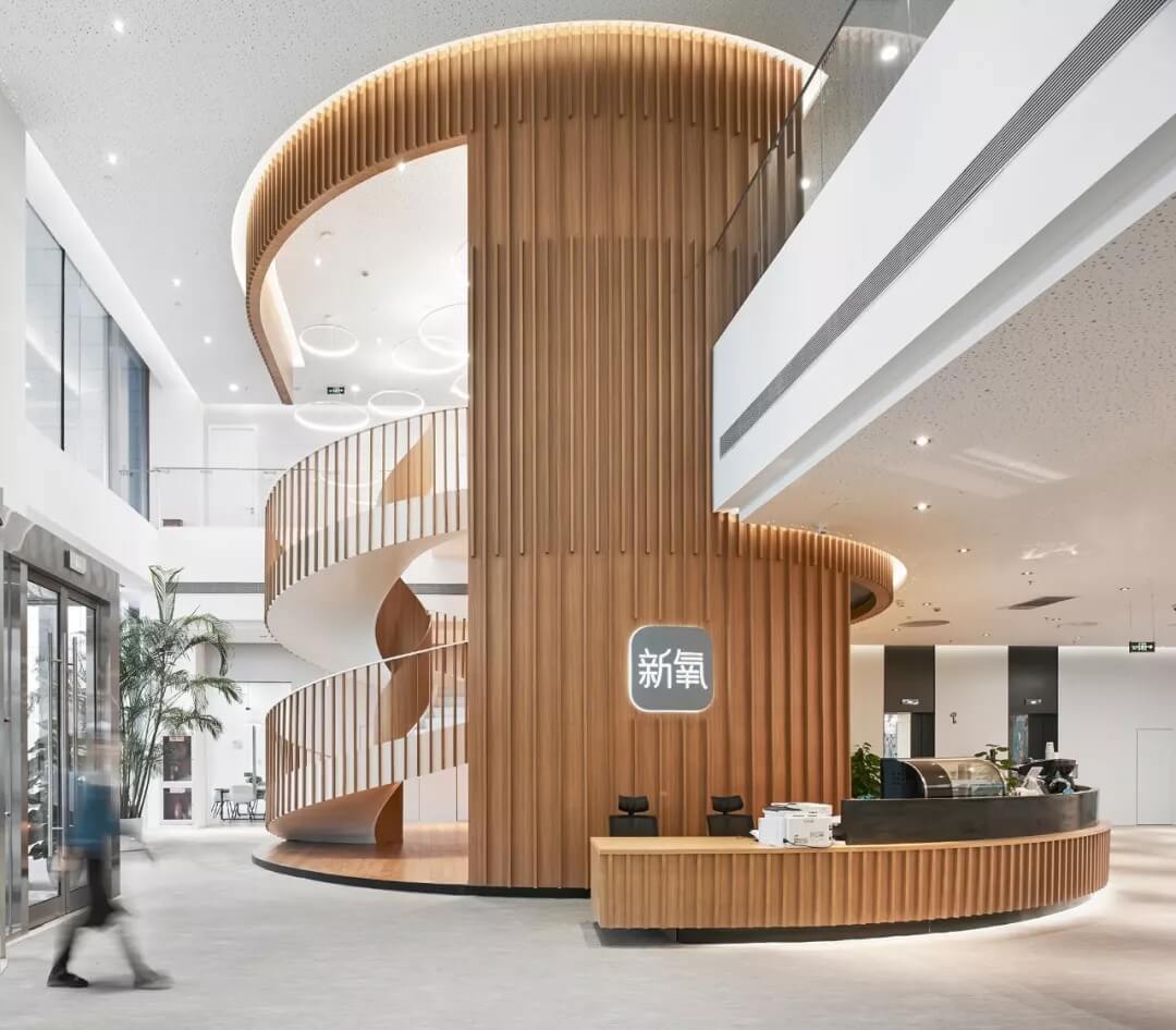 美麗生活館中最矚目的是兩個圓柱體空間模塊,一個是貫穿1-2層的木格柵旋轉(zhuǎn)樓梯,半開半包,與咖啡館及接待臺合嵌為一體,溫馨,時尚,樓梯的內(nèi)側(cè)展示新氧的榮譽(yù)勛章;一個是透明的柱狀空間,以靜態(tài)裝置的方式展示新氧文化,周圍布置洽談交流座椅;大堂南側(cè)用文化墻隔出開放的休閑洽談區(qū)和面試及收發(fā)室的圍合空間。