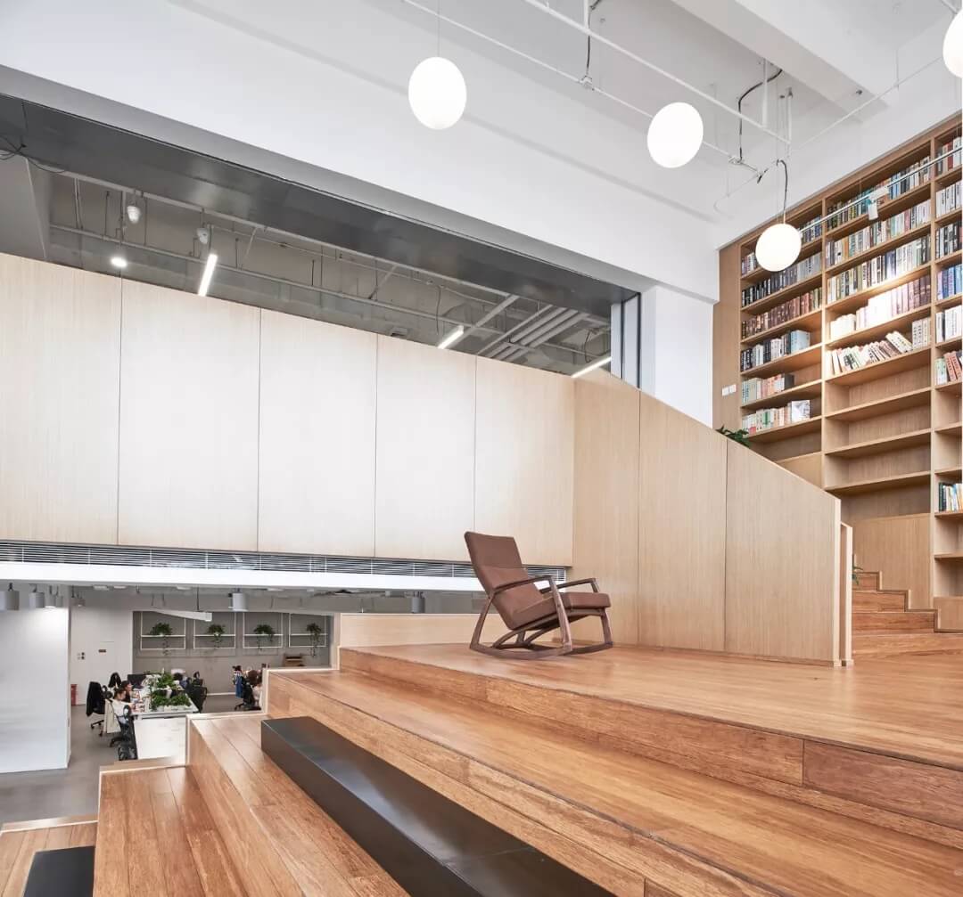 美不止于外在,更追求內(nèi)心。8-9層是新氧心靈之約—圖書閱讀區(qū)。木飾面板大樓梯,高懸掛的裝飾燈,營造出安靜舒適的閱讀氛圍,同時也可以作為小型沙龍或讀書分享活動場所。