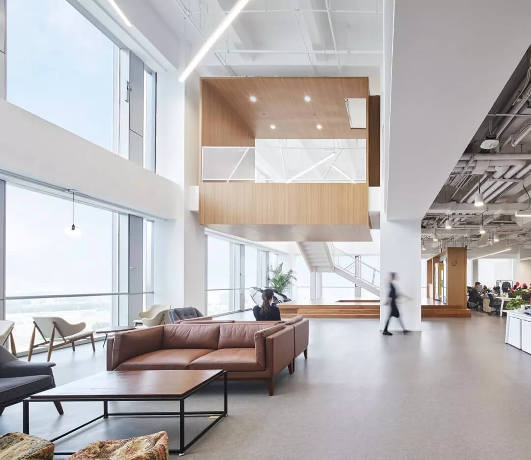 都市客廳島,選擇流暢線條的螺旋樓梯貫穿上下,運(yùn)用條形面板錯縫排列成弧形的照明方式,使整個空間照度均勻,且條形面板亦可作為裝飾展示面。家居軟裝選用極簡風(fēng)格,流線組擺方式,營造自由靈活的空間,促進(jìn)員工間的交流和溝通。