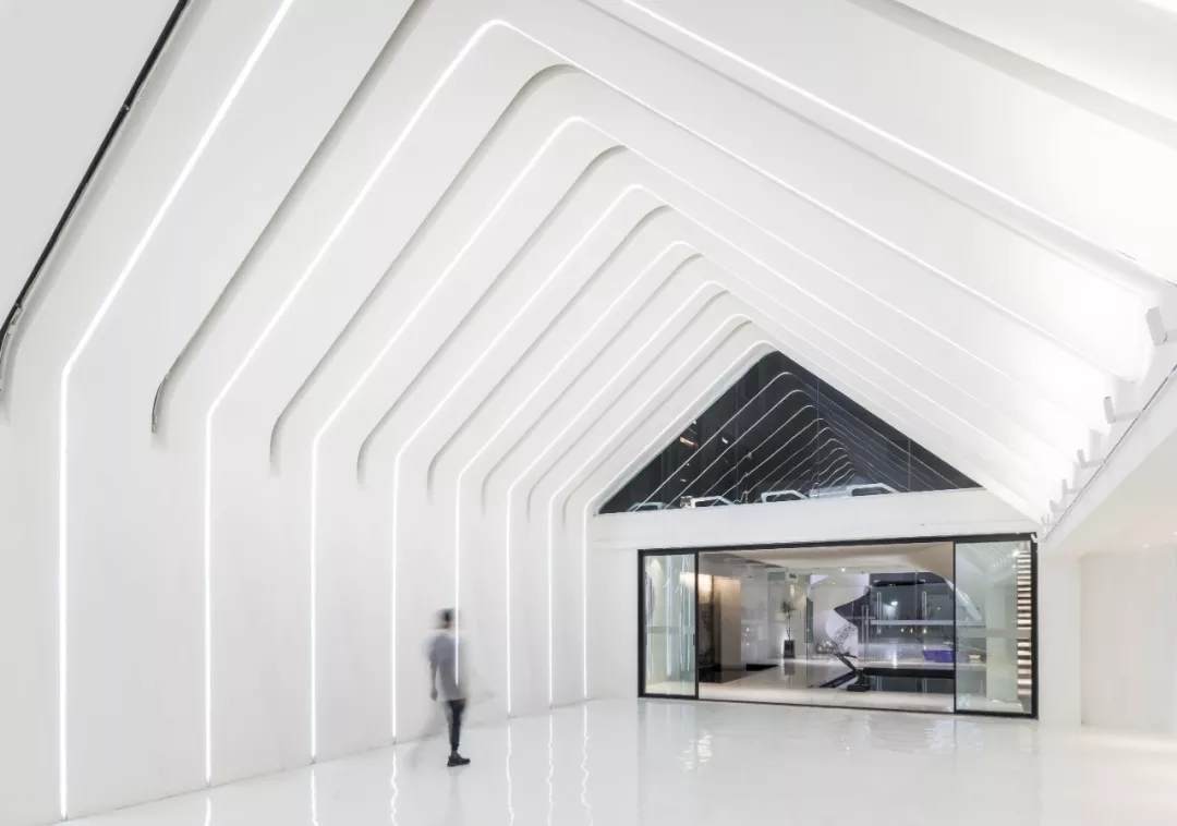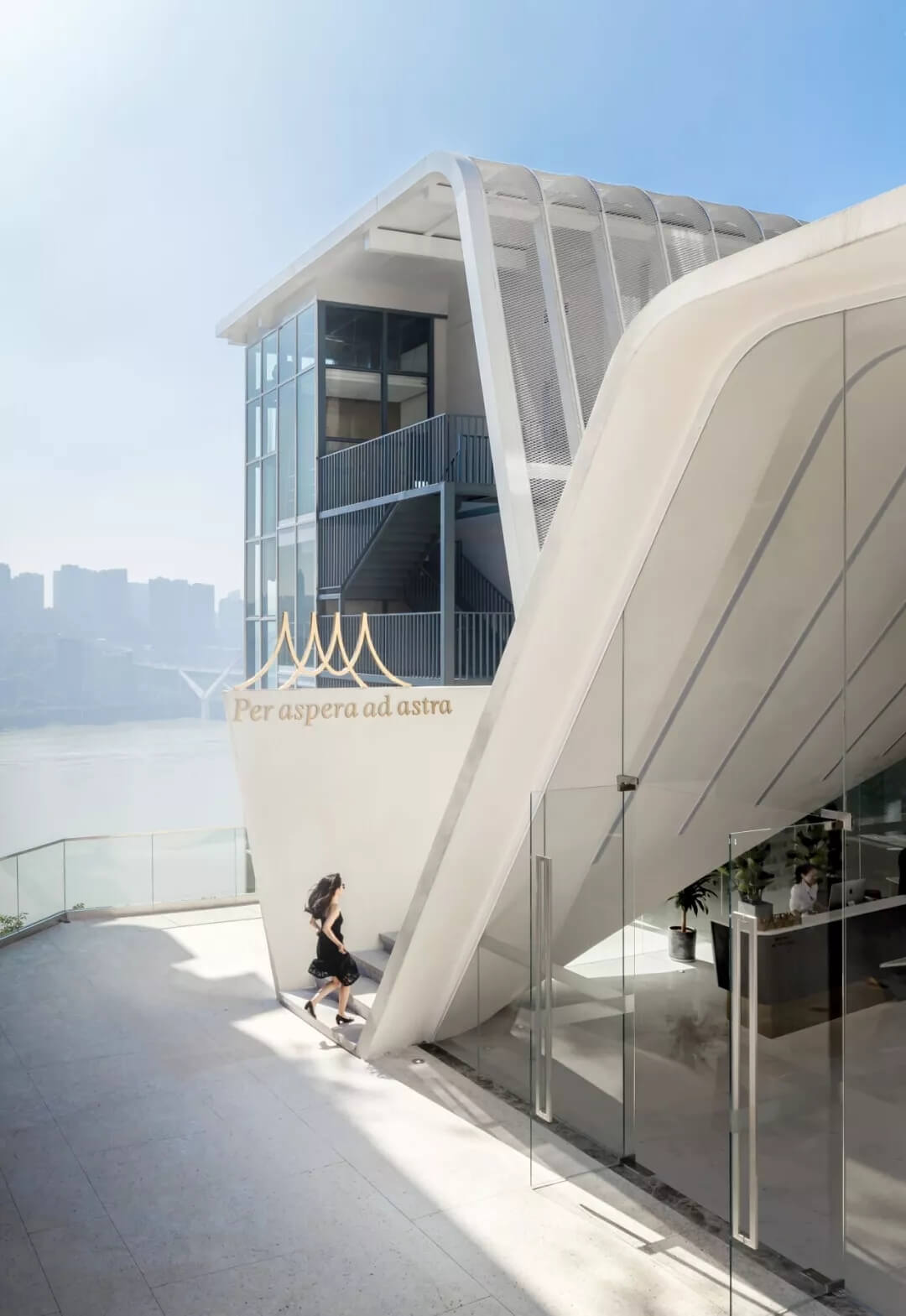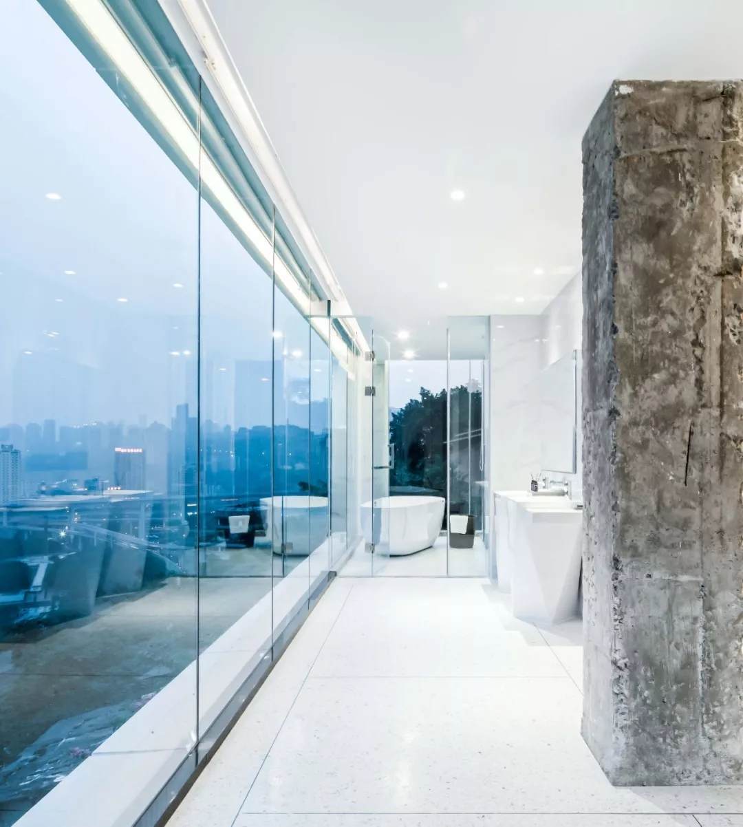薄殼結(jié)構(gòu)與金屬幕墻構(gòu)成的“裙擺”創(chuàng)造出一層集合酒店接待、休憩與多功能廳的開放服務(wù)空間,漂浮為頂,下落為幕,抬升為廳,下沉為梯,旅客可以在裙擺之上游走,形成一條多變的觀景路徑,還原了山城的空間體驗。