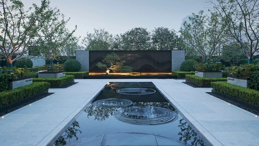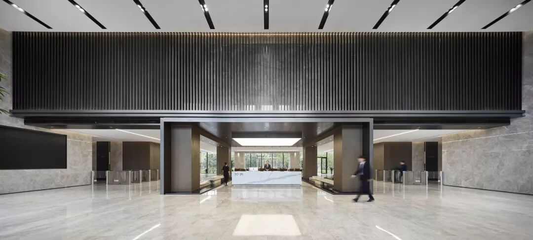 大堂是開放,通透,自然的園林式空間,自成一片天地。踏入大堂即可看到前廳接待島,方形四面通透的造型,嚴(yán)謹(jǐn)不失靈活,結(jié)合流動水景和盆景,營造了生態(tài)的,四季怡情的綠色辦公。電梯廳出入口在接待島兩側(cè),實現(xiàn)快速集散,避免上下班高峰期等候擁堵。咖啡等候區(qū)玻璃窗形成框景,把室外花園內(nèi)的四季變幻,自然元素都納入到室內(nèi)來,形成情景共融。