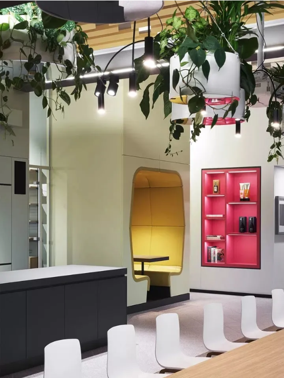 首先,設(shè)計(jì)團(tuán)隊(duì)為這處工作場(chǎng)所增添了2100個(gè)超級(jí)盆栽植物。綠植能產(chǎn)生良好的情緒、降低精神壓力、促進(jìn)創(chuàng)新、提高績(jī)效。此外,綠植還能改善空氣質(zhì)量、營(yíng)造健康環(huán)境,并起到降噪的作用。它們只需定期澆水就能保持茂盛狀態(tài),因此深得人心。室內(nèi)盆栽植物具有強(qiáng)大的正能量。自從加入了這些綠化,室內(nèi)濕度不僅從18%增加到44%,讓人們的體感非常舒適,連員工的病假都減少了一半!