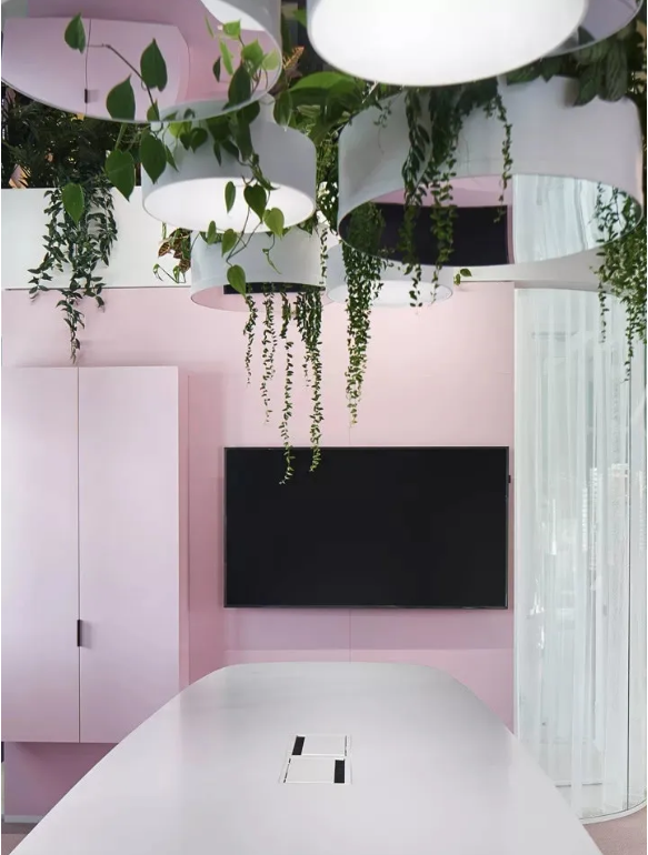 工作區(qū)采用中性色設(shè)計(jì),利于專注工作。淡粉色的走道是真正的情緒助推器,它喚起了員工之間的情感共鳴。精心布置的水源和雅致的燈光設(shè)計(jì)有助于帶來更愉悅的心情。熱帶壁紙與柔軟的沙發(fā)和小圓桌塑造了一個(gè)熱情洋溢的活力氛圍。