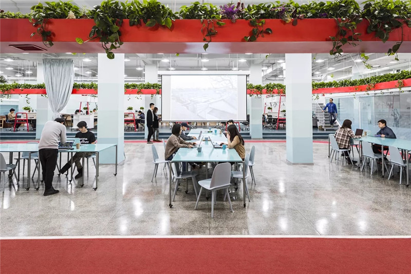 5個公司由一個中間懸掛的“紅環(huán)”聯(lián)系在一起,紅環(huán)上種植蔬菜與植物,下面對應(yīng)的是跑道。員工在跑道健步的同時可以打電話,也可以與照料植物的同事進(jìn)行交談。