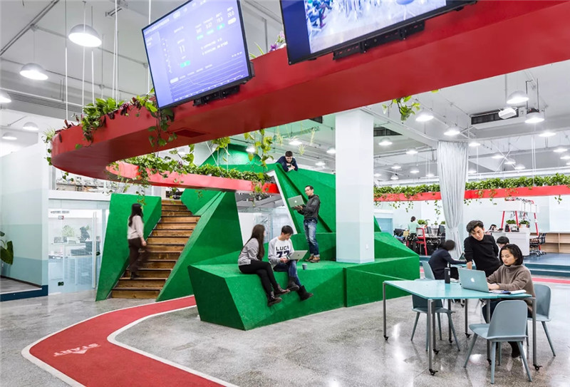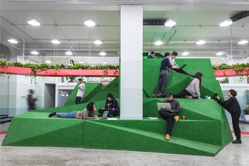 與“紅環(huán)”相交的“小山”是另一處混合休閑與工作的場所,坐落在辦公空間的另一端,傾斜的表面適應(yīng)各種姿勢,中間的小路通往夾層。辦公室內(nèi)還配有專門的活動空間,包括一個單獨(dú)的健身房,冥想空間和會議室。