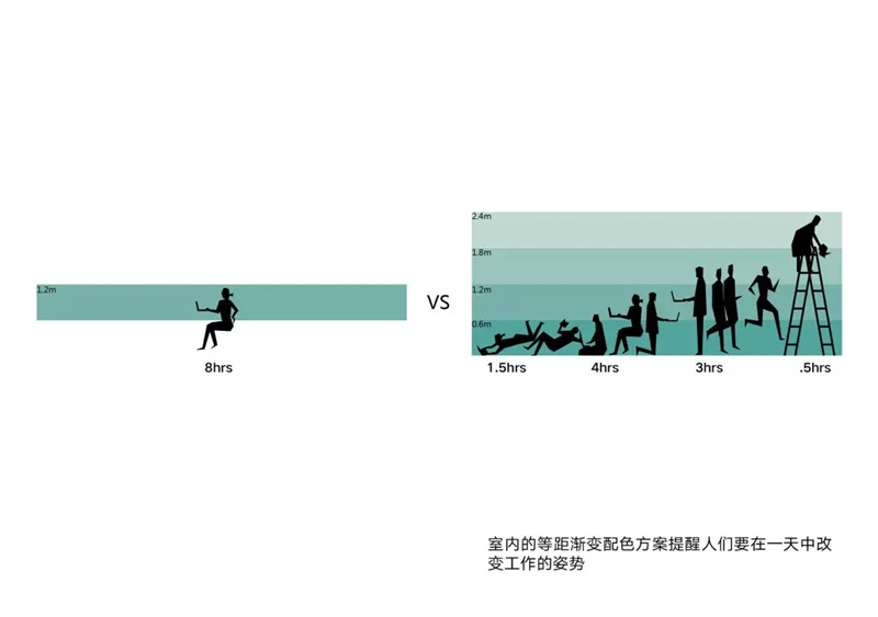 室內(nèi)的顏色旨在提醒人們時刻保持活動,變換工作的姿勢。覆蓋墻身和立柱的藍(lán)色以60厘米為間隔漸變,每個顏色對應(yīng)不同的姿勢和活動,如躺、坐、行走和攀爬。