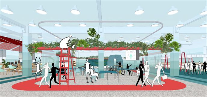 “凹凸桌”這個模塊化的家具可單獨(dú)使用,也可組合成各種不同狀態(tài)。因?yàn)樗?,使?ldquo;紅環(huán)”內(nèi)的空間可作為臨時大型活動空間,也可成為孵化社會企業(yè)的靈活空間。“眾行頂”可在空間內(nèi)靈活移動與展開,結(jié)合“凹凸桌”,隨時構(gòu)建出獨(dú)立的會議空間。