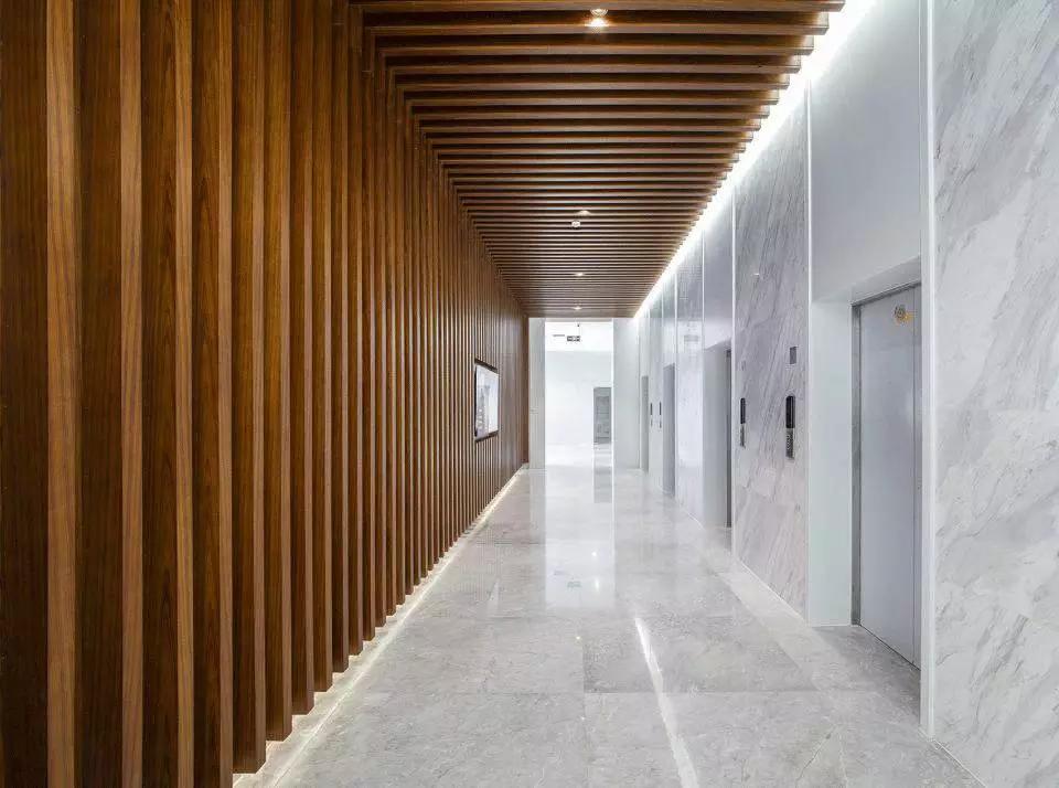 不同的空間內(nèi)容對應不同的材質(zhì)氛圍,從色彩到質(zhì)感,再到意象化的裝飾,我們依據(jù)大堂、會議、休息室、中庭等不同空間尺度與空間內(nèi)容營造新穎豐富、恰如其分的空間氛圍。溫暖的木色、混凝土板、白色大理石和白色乳膠漆為主要材料,其中報告廳大異其趣,優(yōu)雅高貴的深灰色布藝軟包與報告廳的相對集中和封閉性相得益彰。我們依托原有建筑空間序列,如大堂-電梯廳-等候區(qū)-多功能廳-VIP室-展廳,調(diào)整改變室內(nèi)設計的溫度與濃度,為原本純功能理性化的空間組織蒙上一層魅力面紗,讓功能化的“經(jīng)過”變?yōu)橐淮尾簧岬鸟v留與感受。