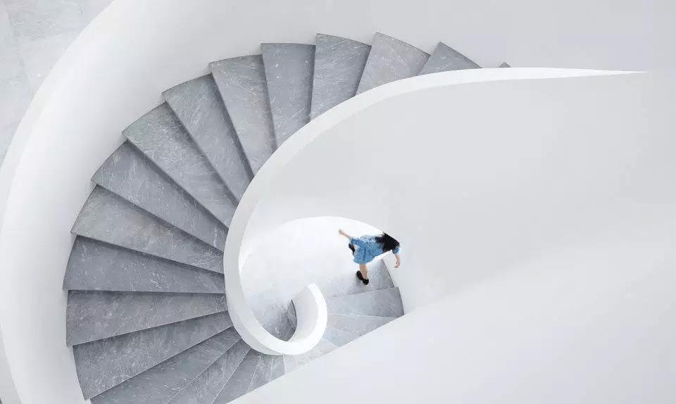 從中庭的自然光到室內(nèi)的人工光,大廈的光影在豁然開朗和細致入微之中不斷變換。中庭必須和天空有所交流,尤其是霧霾肆虐的今天,藍天顯得特別稀有,在中庭上方加蓋玻璃幕墻為上策。流空素影正翩翻,使得存在于強烈靜態(tài)空間體驗中的人又能同時感受到光影與云卷云舒的動態(tài)變化。在典型的辦公樓層,小型私人會議室從中庭立面懸挑而出,并錯落有致,打破了中庭的單調(diào),并增加了最小辦公空間的面積。一側(cè)的螺旋樓梯飄逸靈動,用混凝土演繹出的獨特輕薄感如風裳皎立,引辦公的人們靈感興發(fā)。