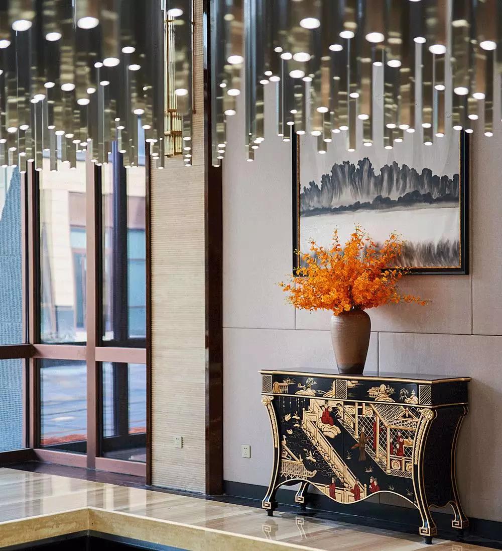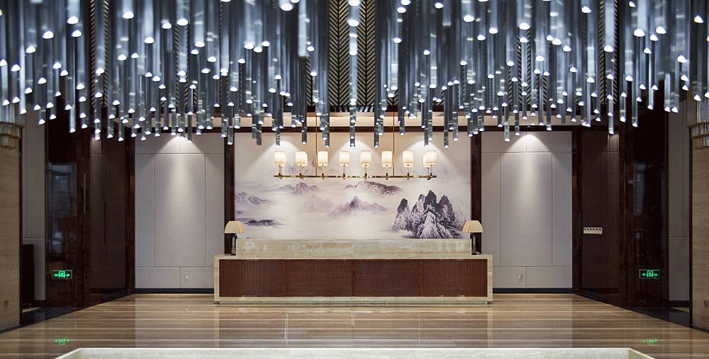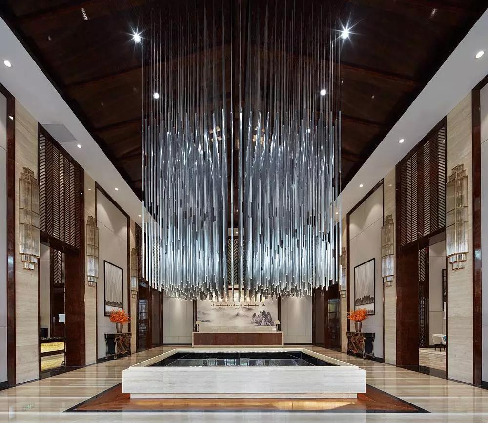 進(jìn)入大堂中心,便被一個奪人眼目的裝置藝術(shù)吸引,數(shù)百根不銹鋼條垂吊而下,宛如瀑布“飛流直下三千尺,疑是銀河落九天”,成為整個空間的視覺焦點,啟動后,水珠從不銹鋼滴落到地景的水中,呈現(xiàn)出“大珠小珠落玉盤”的動感。