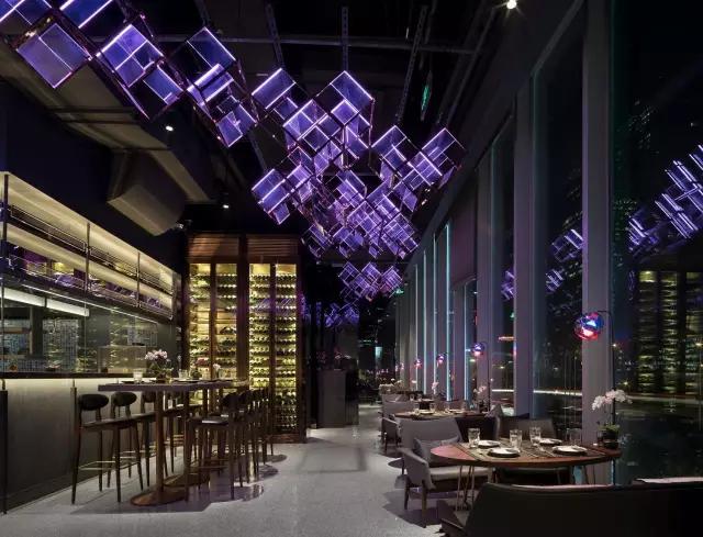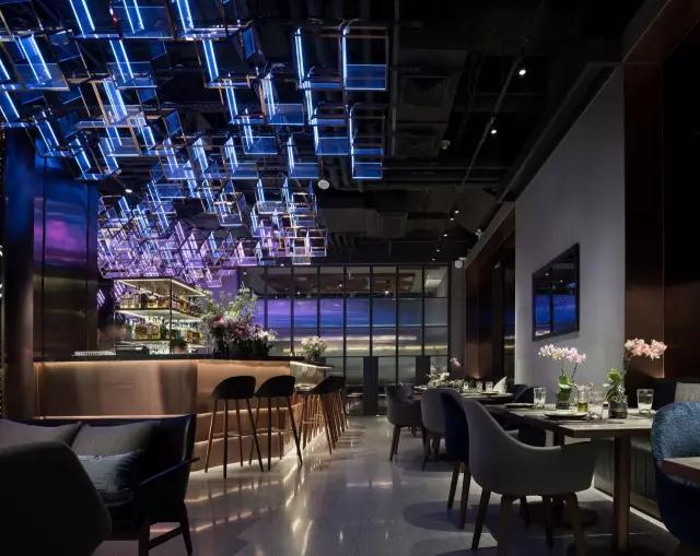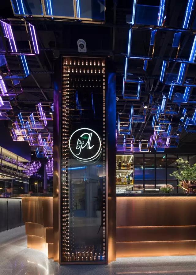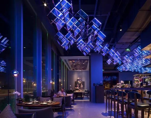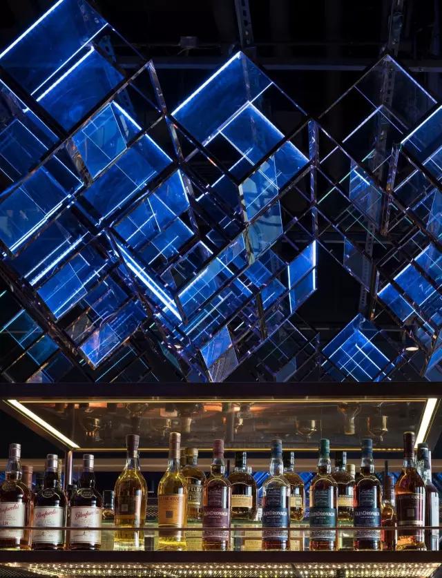 attabj意大利餐廳最美之處便是天頂上的藝術(shù)燈群,設(shè)計師通過抽象化、藝術(shù)化的手法,將這一感官體驗濃縮為空間當中的一組裝置,透明亞克力單元體如同酒杯內(nèi)的冰塊,而不斷變幻的LED燈光就像是色彩斑斕的酒體,兩者相互反應(yīng)形成夢幻迷離的光影效果。
