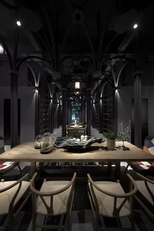 原建筑空間剛剛結(jié)束了破敗的工業(yè)廠房的狀態(tài),業(yè)主接手時還是一片狼藉。項目的運營團隊希望打造集餐飲區(qū)、咖啡區(qū)、音樂活動區(qū)及一個塔羅牌活動區(qū)為一體的復合空間。設計團隊從項目的主題概念中所散發(fā)的神秘色彩入手,希望在偏精神層面的建筑中汲取靈感,翻閱并走訪了大量的哥特式建筑,從挺拔向上的建筑空間結(jié)構中體會與神對話的力量感,然后將其移植到這個項目中,以當代的構成形式,向傳統(tǒng)建筑致敬。
